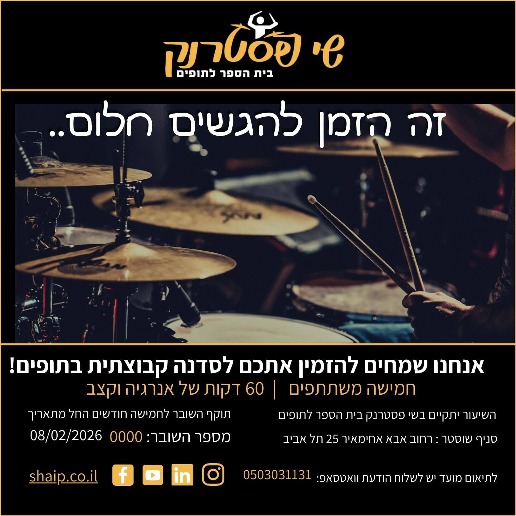 שובר מעוצב לסדנת תופים קבוצית במתנה. חוויה קבוציתית שטרם עשיתם. אין צורך בניסיון! חוויה משחררת, מיוחדת וכייף גדול! 60 דקות של סדנה פרטית במתחם התופים היחידי בישראל! לאחר הרכישה ישלח השובר למייל (עד 2 ימי עסקים) עם שם המשתתף על גבי השובר. ניתן לקיים סדנה לעד 31 משתתפים, במידה ותרצו להגיע יותר משתתפים נא לפנות בהודעת וואצאפ 0503031131 לחצ/י כאן לפרטים נוספים ומדיניות ביטולים